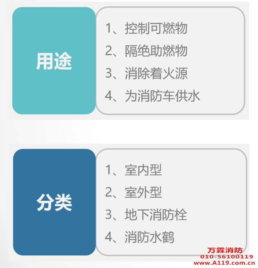 现有的消防栓主要供消防车从市政给水管网或室外消防给水 管网取水实施灭火,也可以直接连接水带、水枪出水灭火。