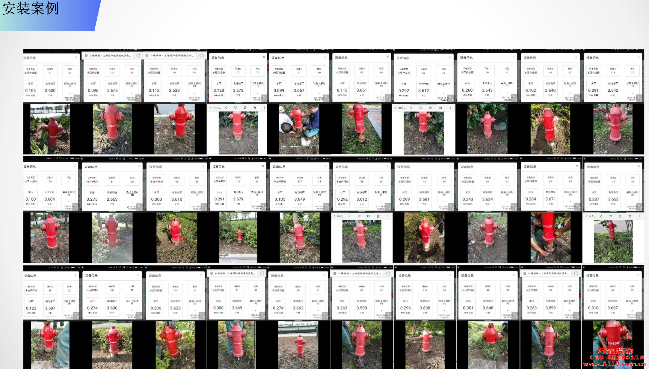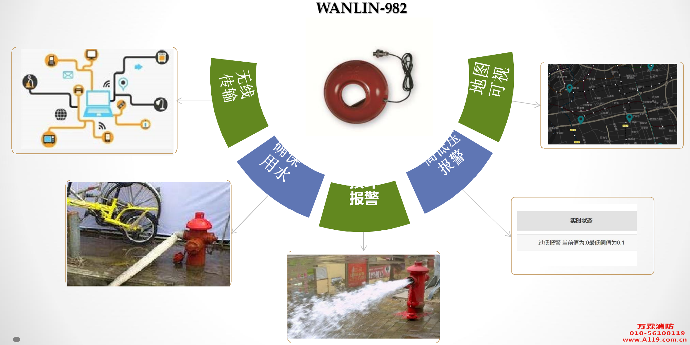 万霖物联网通过对消防行业的深入了解,利用多年在物联网行业积累的联网 技术解决消防栓系统管网水压、水池水位、水泵控制器状态以及阀门、消防栓状 态(撞倒、水压、漏损)等信息采集及传输问题。